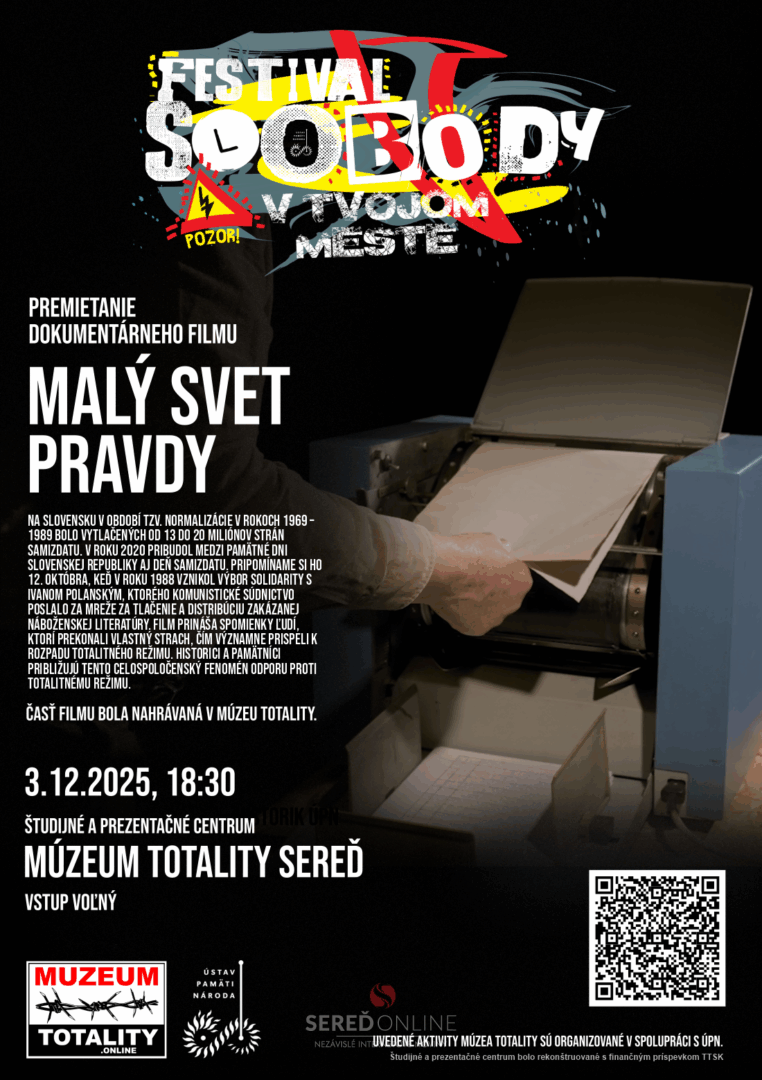 Sereď | Už zajtra, teda v stredu 03. decembra 2025 o 18:30 hodine si v Múzeu totality na Trnavskej ulici 53 v Seredi (vedľa sociálnych bytov mesta Sereď), budete mať možnosť pozrieť dokument o odvážnych ľuďoch, ktorí sa za socializmu postavili proti totalitnému režimu: