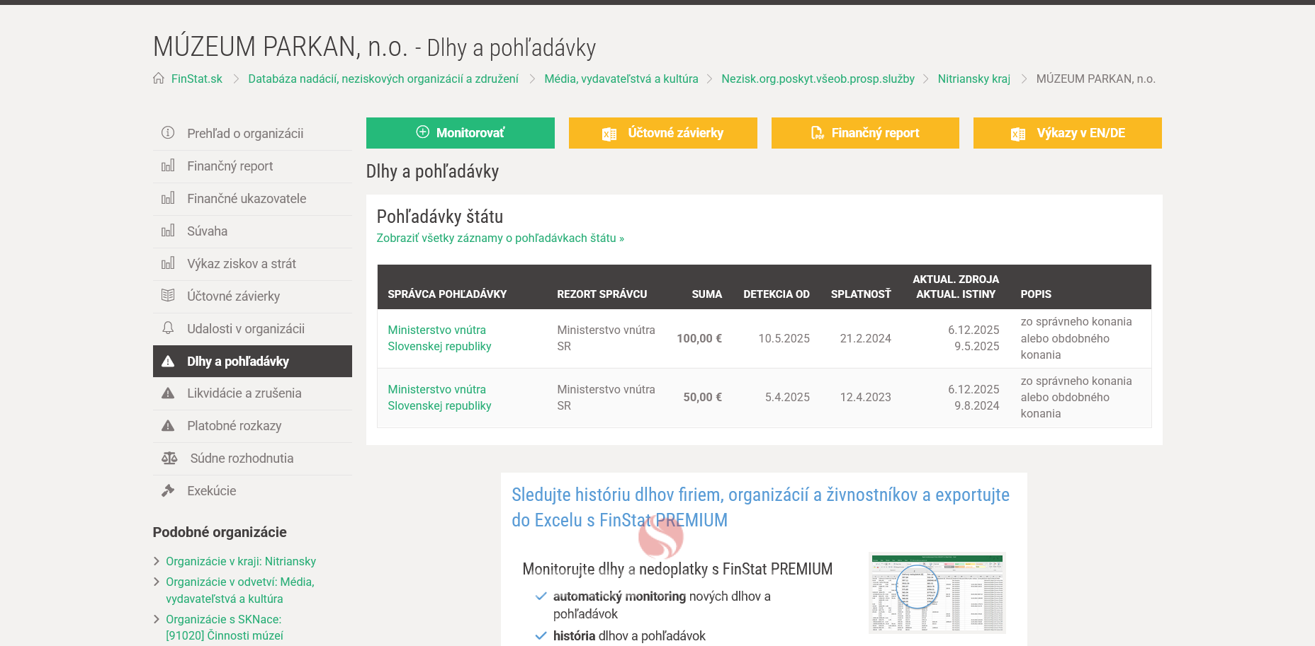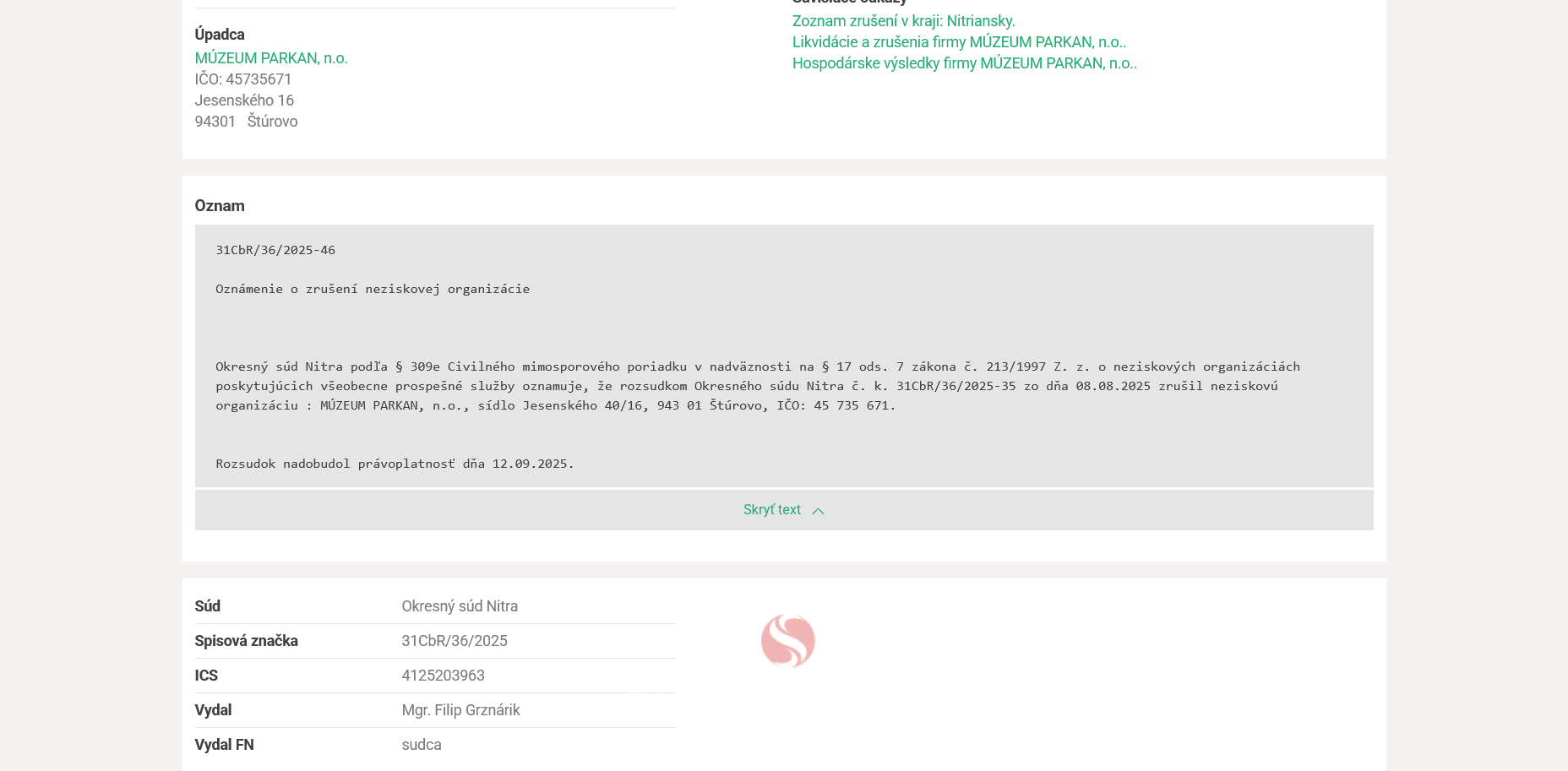 V septembri 2025 Múzeum Parkan n.o. Petra Sklenára st. podľa verejne dostupných údajov skončilo zrušené bez likvidácie.