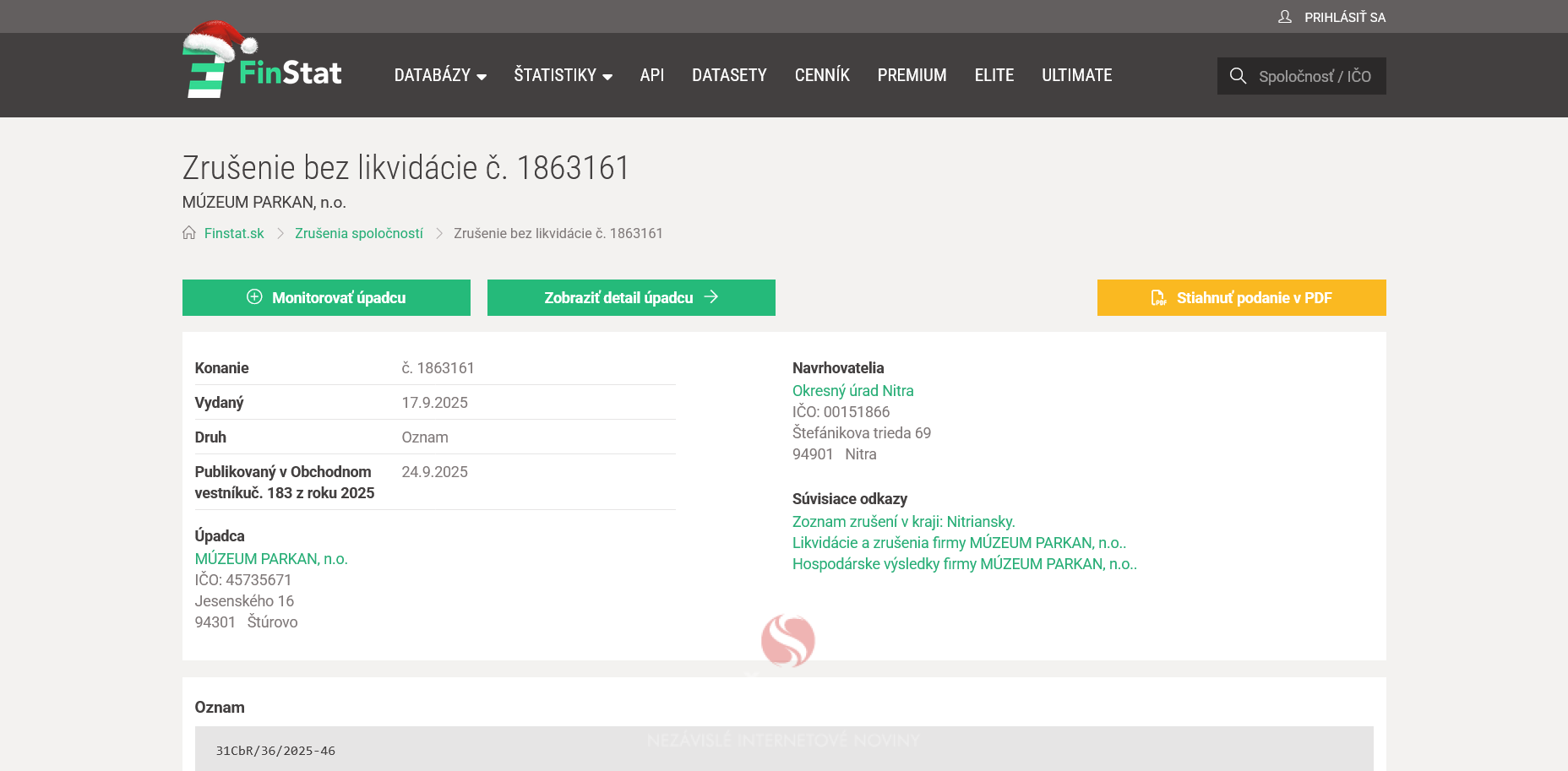 V septembri 2025 Múzeum Parkan n.o. Petra Sklenára st. podľa verejne dostupných údajov skončilo zrušené bez likvidácie.