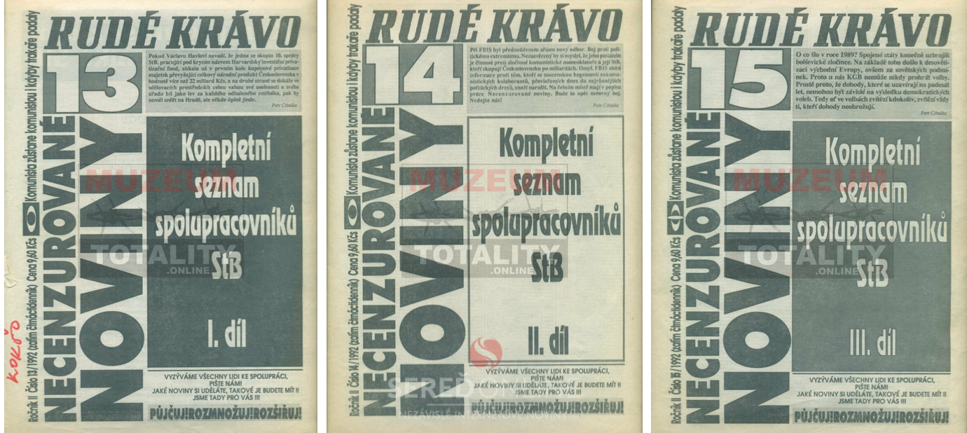 Disident Petr Cibulka začal s vydávaním necenzurovaných novín Ty rudá krávo, v ktorých uverejnil aj zoznamy spolupracovníkov a samotných profesionálnych agentov bývalej totalitnej Štátnej bezpečnosti – ŠTB.
