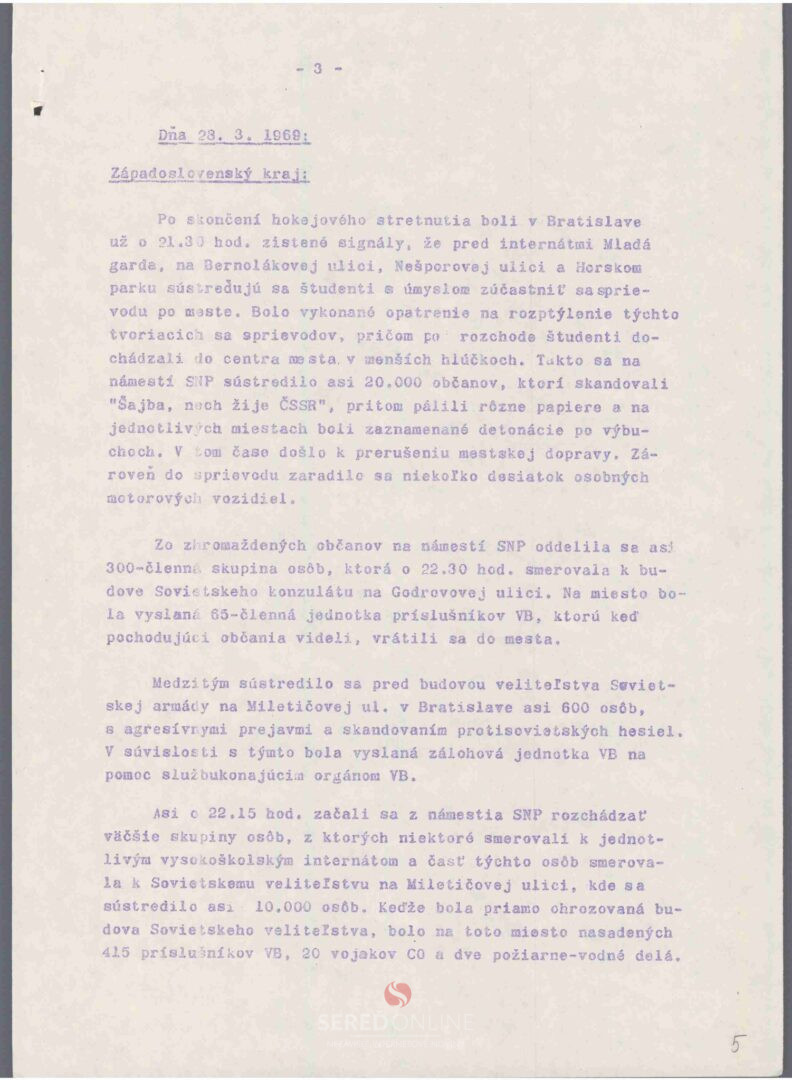 „Po skončení hokejového zápasu medzi Československom a Sovietskym zväzom boli v Bratislave už o 21:30 zistené signály, že pred internátmi sa sústreďujú študenti s úmyslom vydať sa na sprievod mestom.“